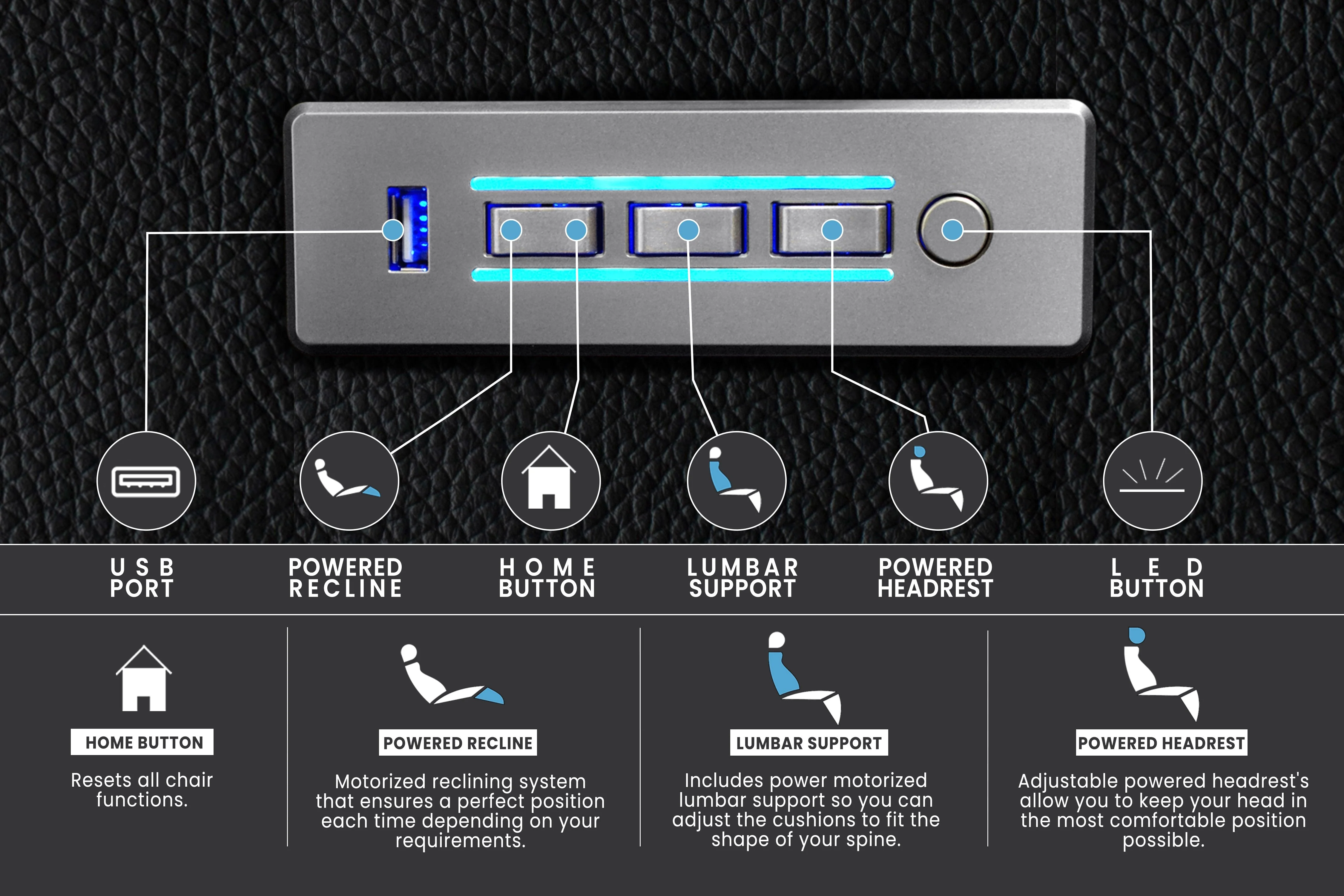 The Oslo will become the center piece of your home theater room. The classy finishes and neat design will be heightened by the cozy cushions, pneumatic lumbar support and powered headrest, making it easier for you to drop down and relax every time. Coupled with a glass of wine and a cheese platter, your evenings will never be the same again.